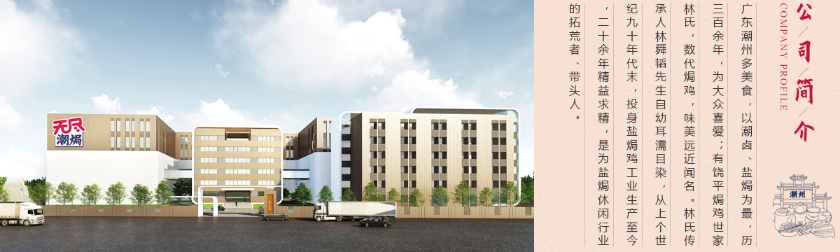 公司拥有现代化、标准化的自建工厂,现有生产面积40000余平方米、先进的专业化生产线12条。无尽食品从解冻、卤制、焗制、烘烤、挑选、真空、灭菌、检验、运输、终端销售全过程都严格执行品质标准化管理,能够为消费者提供健康、安全、美味的潮牌鸡肉休闲食品和优质的服务。