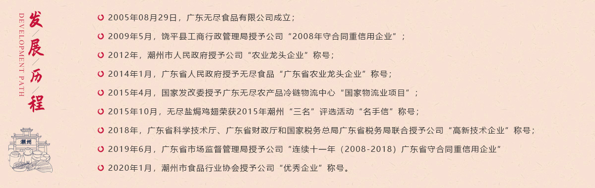 特别值得一提的是,林舜韬及其研发团队感于传统盐焗工艺重盐,决心为顺应年轻一代的健康追求而改变。由无尽团队历时十数年独创的【厚卤轻焗】制法,结合了潮汕卤水和盐焗工艺,一改传统厚盐包裹的做法,厚卤入味、轻焗少盐,释放鸡肉自然之香,形成淡一点、口感弹、肉质嫩、骨脆口留香的潮焗工艺。公司独创的潮焗工艺,创造性的将现代化工艺与传统古法相结合,于2021年10月接受中央电视台《家乡至味》栏目采访,并以纪录片形式在中央台播出,深受好评。